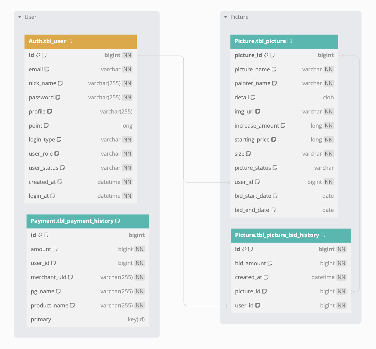 기간이 2주라는 시간으로 짧았기 떄문에 MVP를 개발하는 것에 중점을 두었다. 그러다 보니 필요한 테이블을 검수를 많이 해봤고, 다음의 총 4개의 테이블(엔티티)가 발생하였다.