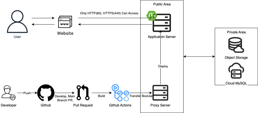 개발자는 Push, PR을 통해 Dev Branch로 Push이벤트를 발생할 경우 GithubActions를 통해 Proxy서버를 경유하여 Application Server에 배포하도록 Private Zone을 구축하였다.