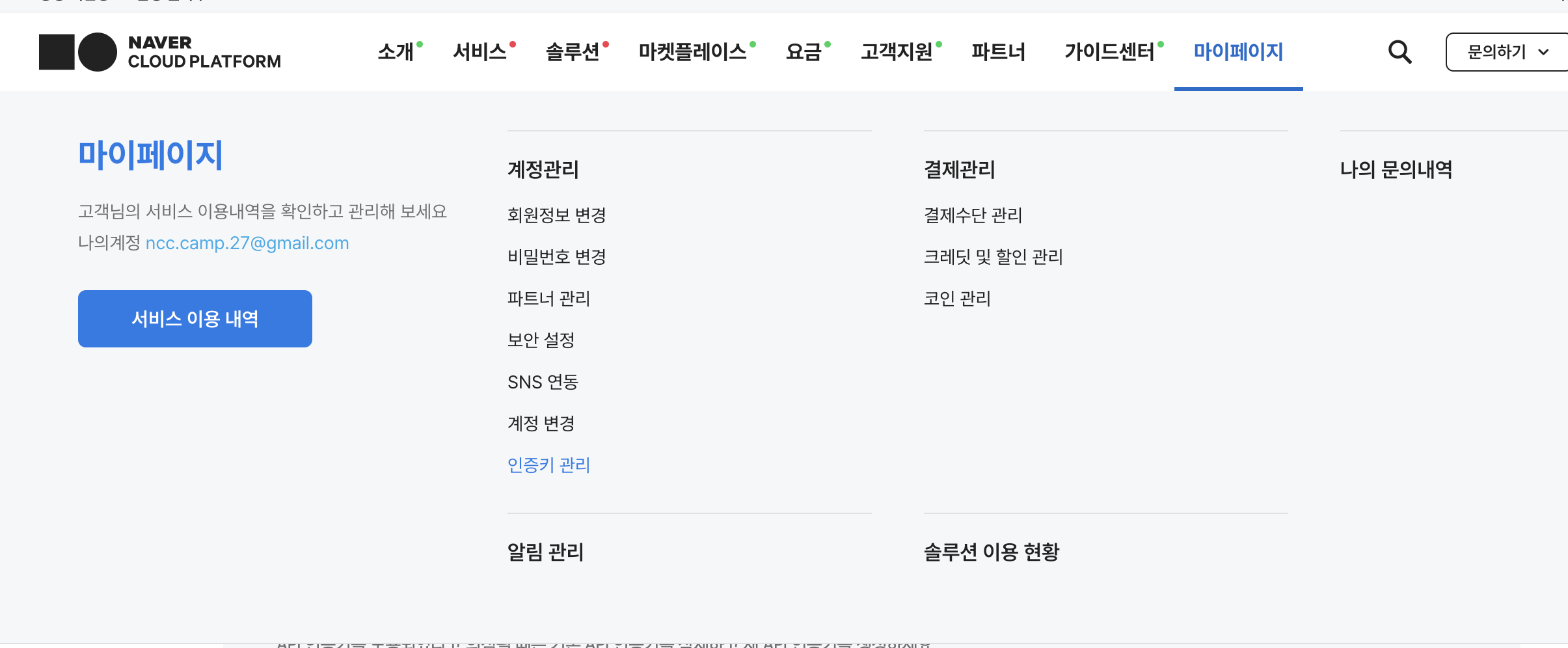 accessKey와 secretKey의 경우에는 Naver Cloud에서 마이페이지 - 인증키 관리에서 추가가 가능하다