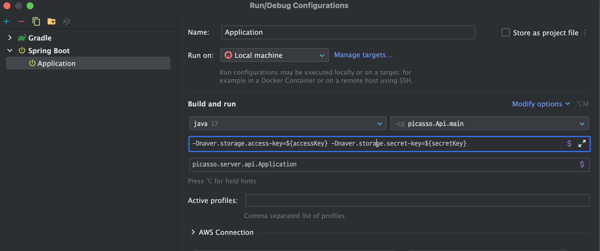 또한 해당속성들은 application.yml에 추가하였으며, 필자가 임의로 추가한 값으며 access-key와 secret-key의 경우에는 실제로는 VM-Option을 활용하였다.