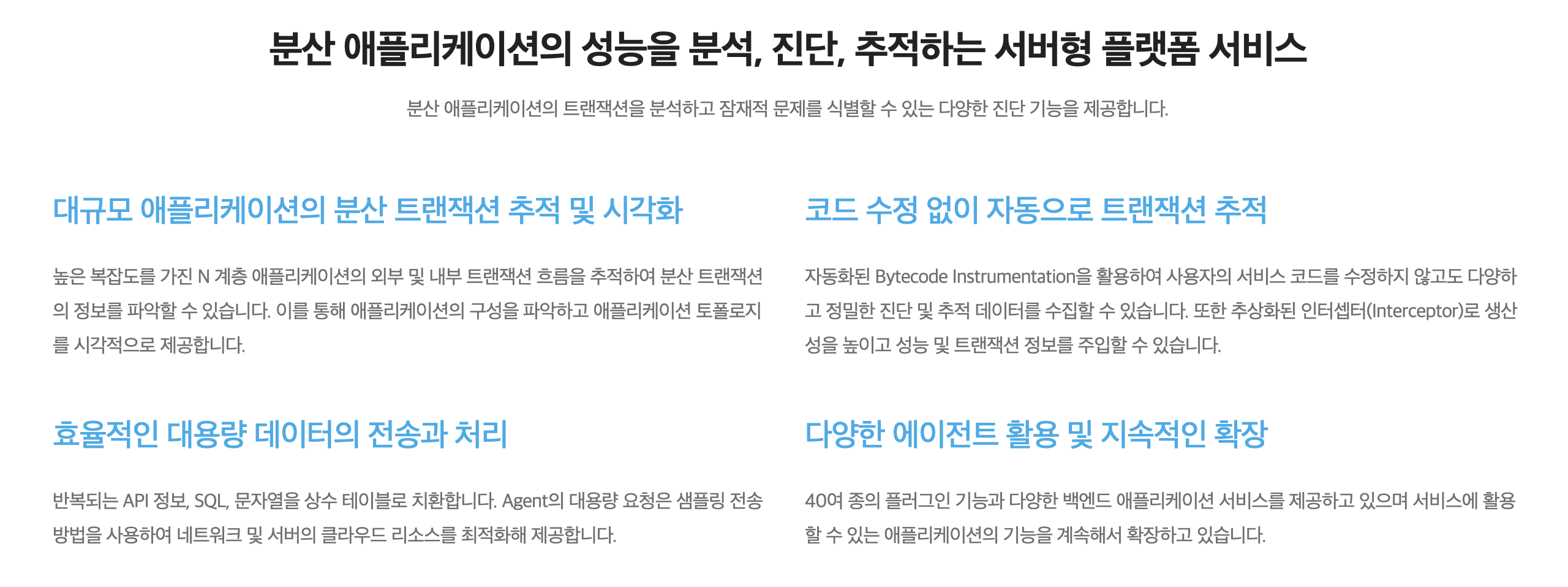 이건 그냥 GPT한테서 받은 대답으로, PinPoint는 어플리케이션에 대한 성능관리로 하기 4가지의 기능을 제공한다.