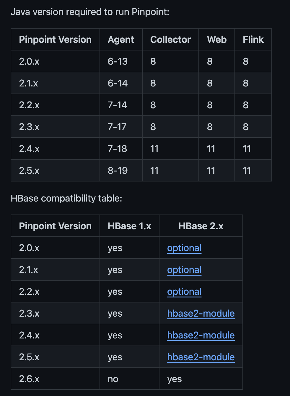 이후 PinPoint의 Repository를 통해 요구되는 JDK의 버전을 확인해보게 되었으며, 2.2.x버전은 JDK7 ~ 14를 Required를 하고 있었다.