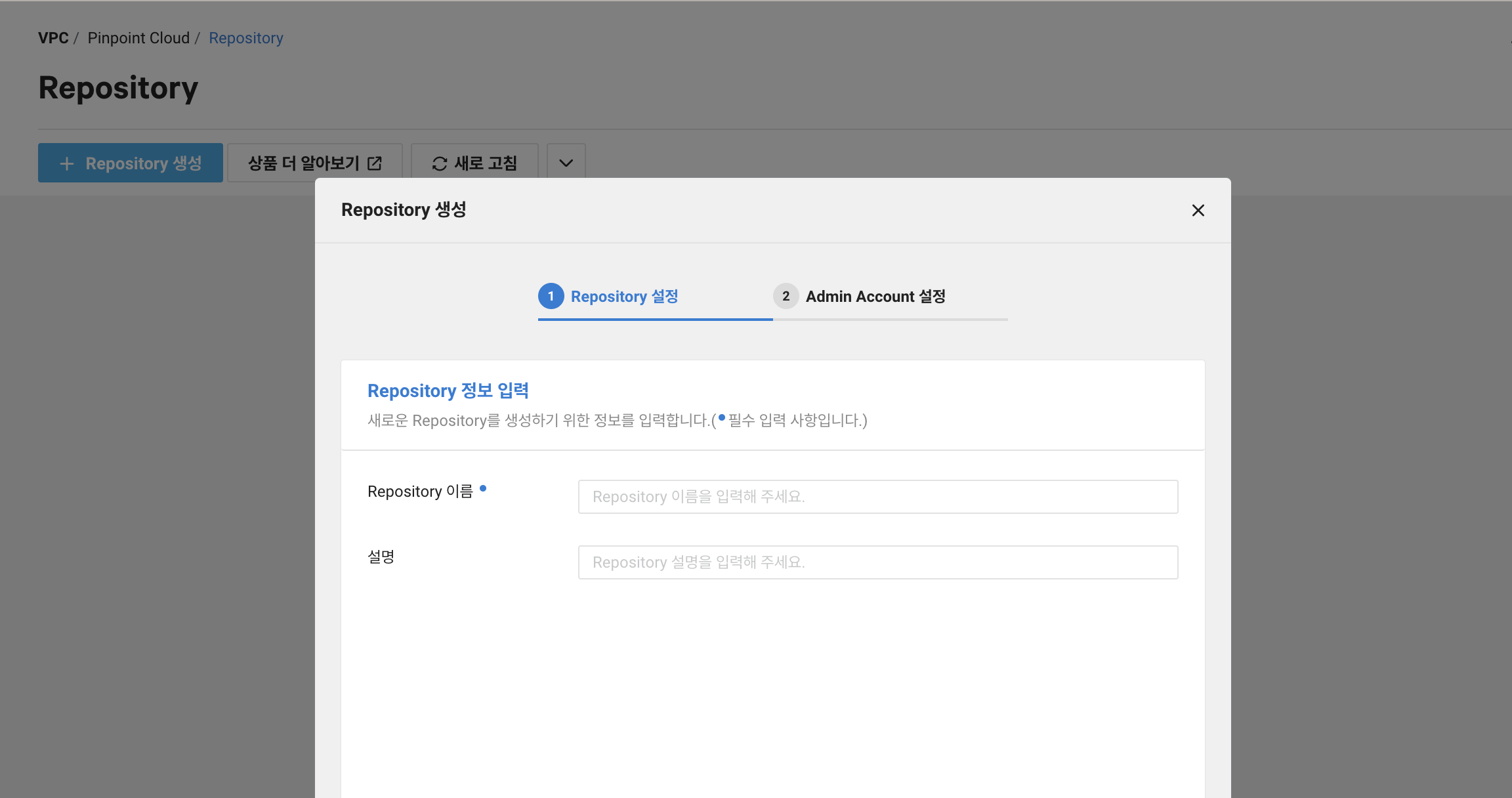 NCP의 PinPoint Cloud 들어가서 아래의 이미지처럼 생성 모달창을 띄우고, Repository짓고 관리자 계정을 설정하면 생성이 된다.