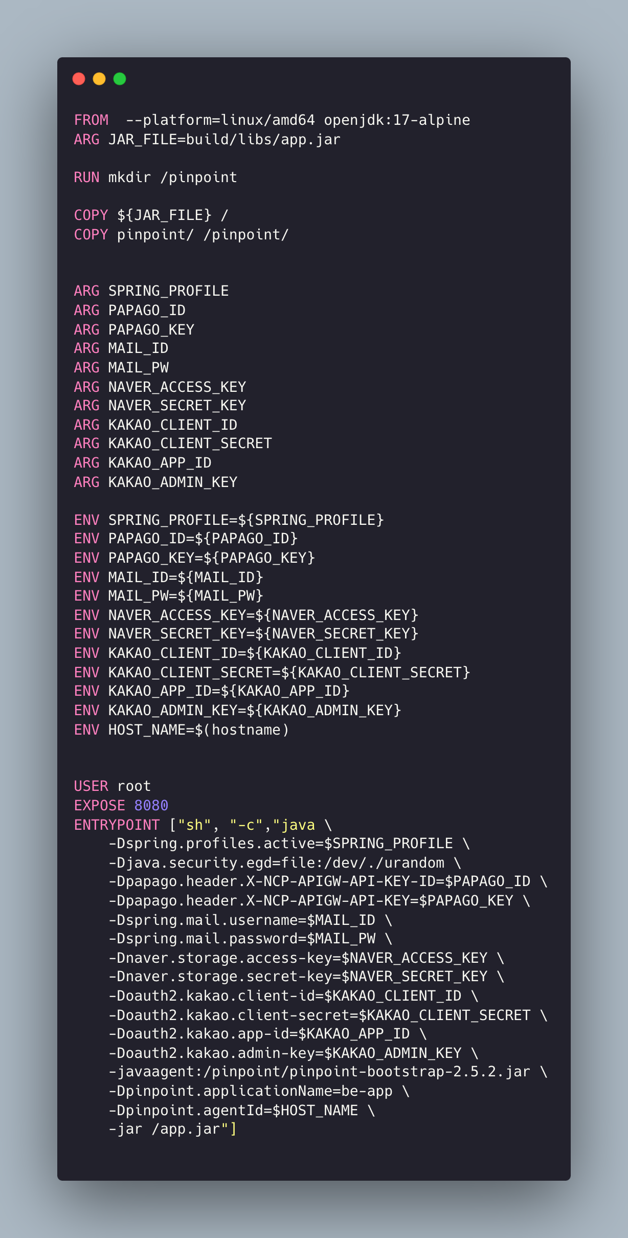 applicationName의 경우에는 PinPoint의 DashBoard에 출력을 하고자 하는 App으로 기록을 하면 되며, agentId의 경우에는 HOST_NAME을 컨테이너 명 또는 서버의 HostName으로 받고자 하여 설정하였다.