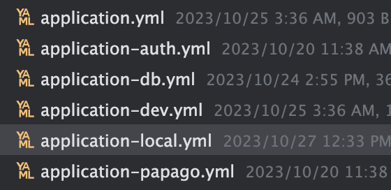 필자의 경우 설정파일을 다음과 같이 구성하였으며, application-local과 application-dev의 차이점 보면 될 듯 하다.