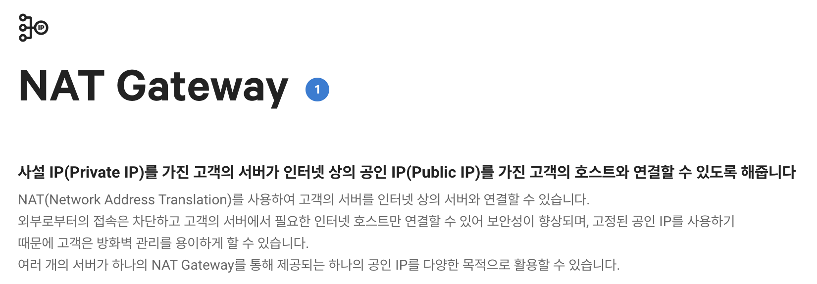 NAT Gateway란 사설IP(Private IP)를 가진 서버나 대역이 인터넷 상의 공인 IP(Public IP)를 가진 서버 , 호스트와 연결을 할 수 있도록 하는 서비스이다. 아래는 실제로 Naver Cloud에서 정의하는 NAT Gateway에 대한 설명이다.