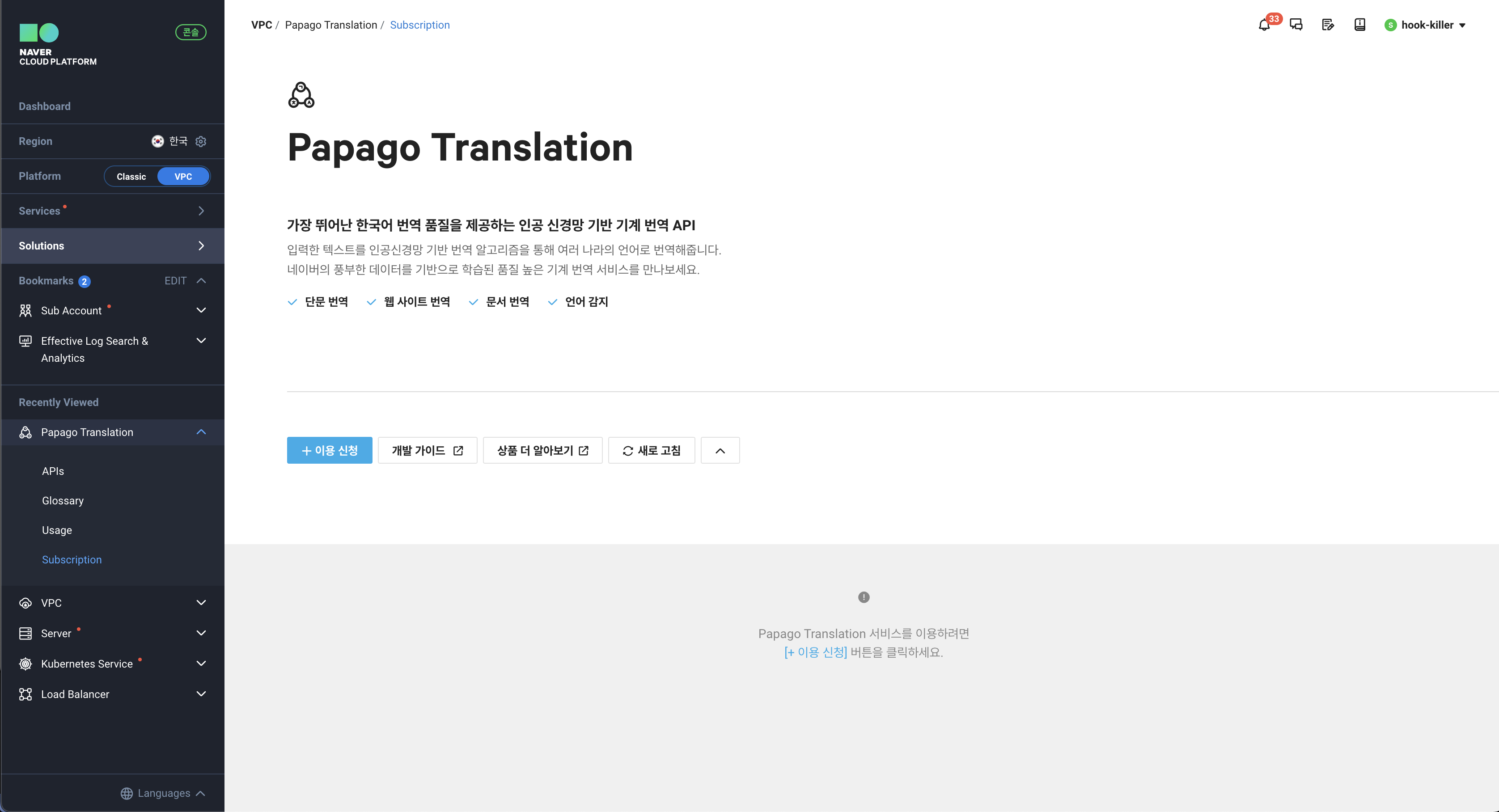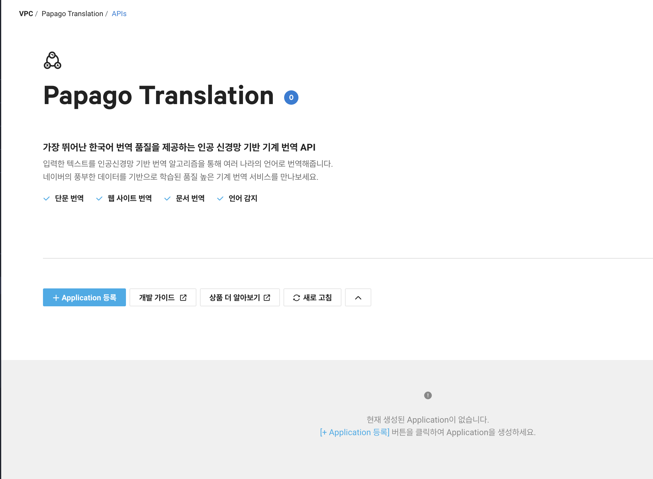 필자가 프로젝트에서 사용해야 하는 항목은 Papago Text Translation(Text번역)과 Papago Website Translation(HTML번역)이다.