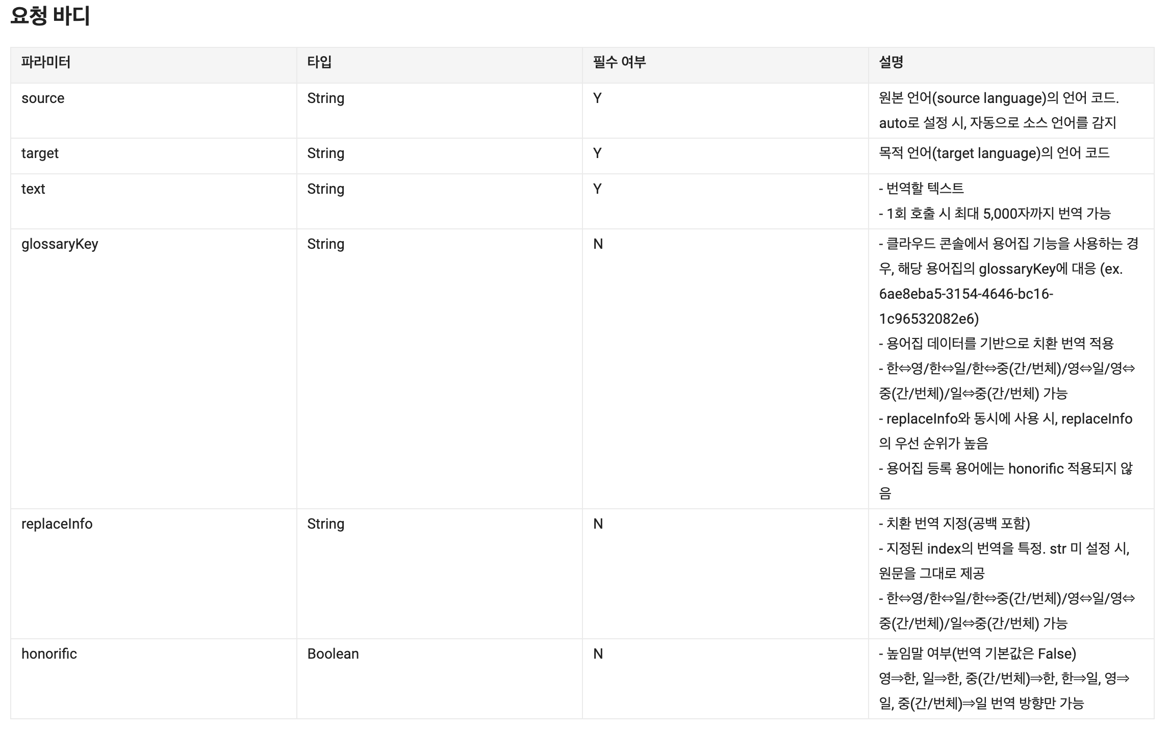 다음으로 요청 Request를 보낼 호스트의 주소이다. 알 수 있는 정보는 POST 메소드로 발송하며 https://naveropenapi.apigw.ntruss.com/nmt/v1/translation링크로 Text, HTML 모두 발송하면 된다는 것이다.