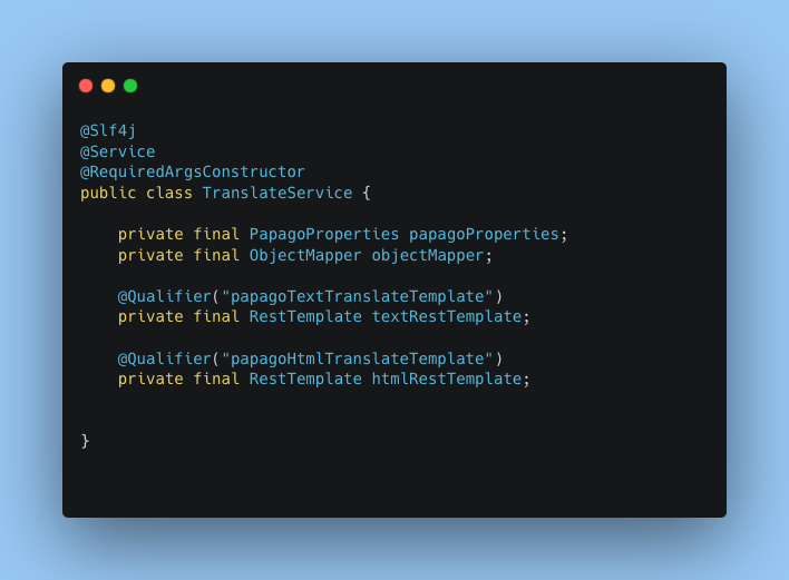 위에서 제작한 두개의 Bean, Papago Properties, 받아온 값을 파싱할 ObjectMapper를 주입하였습니다.