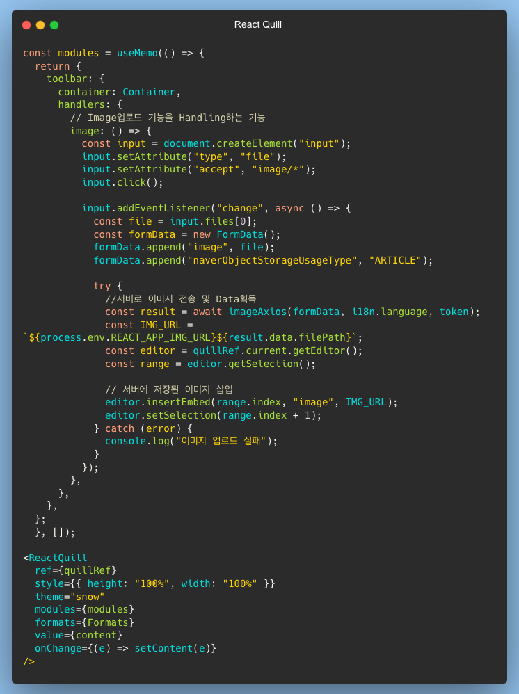 useMemo를 통해 사용할 Module을 선정한다. 이후 handlers에서 Image를 업로드하는 태그인 image의 함수를 제작해주면 작업이 완료된다.