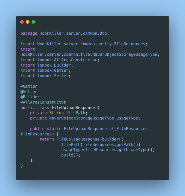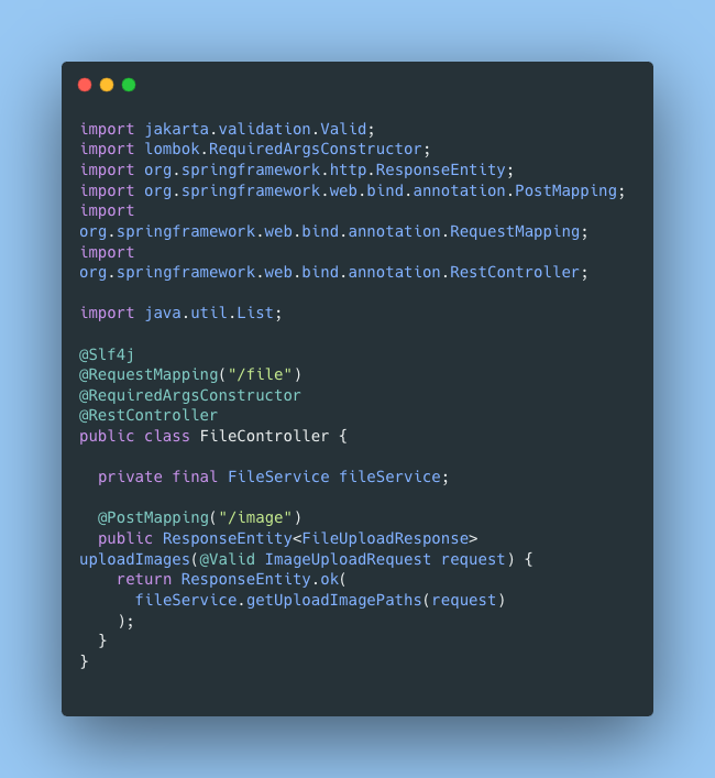 Service에서는 우선적으로 로그인한 사용자인지를 구분하며, 이후 테이블에 요청한 사용자의 정보를 바탕으로 올린 파일정보를 기록해두며, Response객체로 감싸서 Return을 한다.