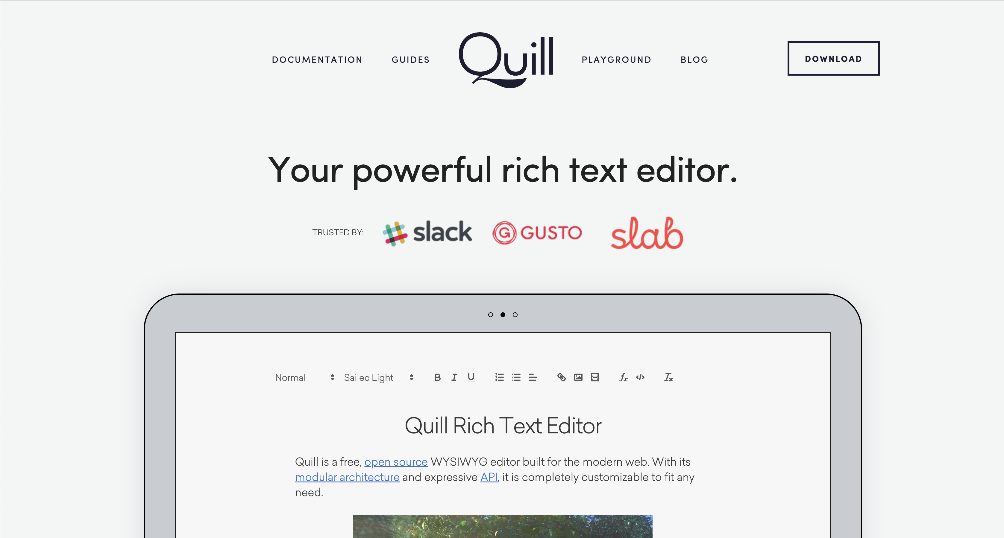 Sailec Light Sofia Pro Slabo 27px Roboto Slab Inconsolata Ubuntu Mono Quill Rich Text Editor Quill is a free, open source WYSIWYG editor built for the modern web. With its modular architecture and expressive API, it is completely customizable to fit any ne