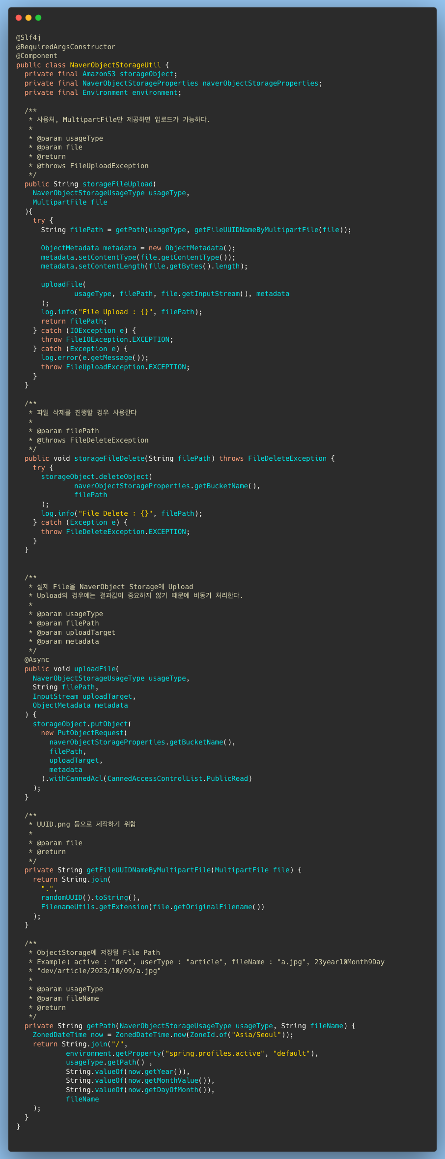 해당 코드에서 실질적인 파일 업로드가 이뤄진다. 정말로 파일 업로드와 변경된 파일 명을 반환만한다.
