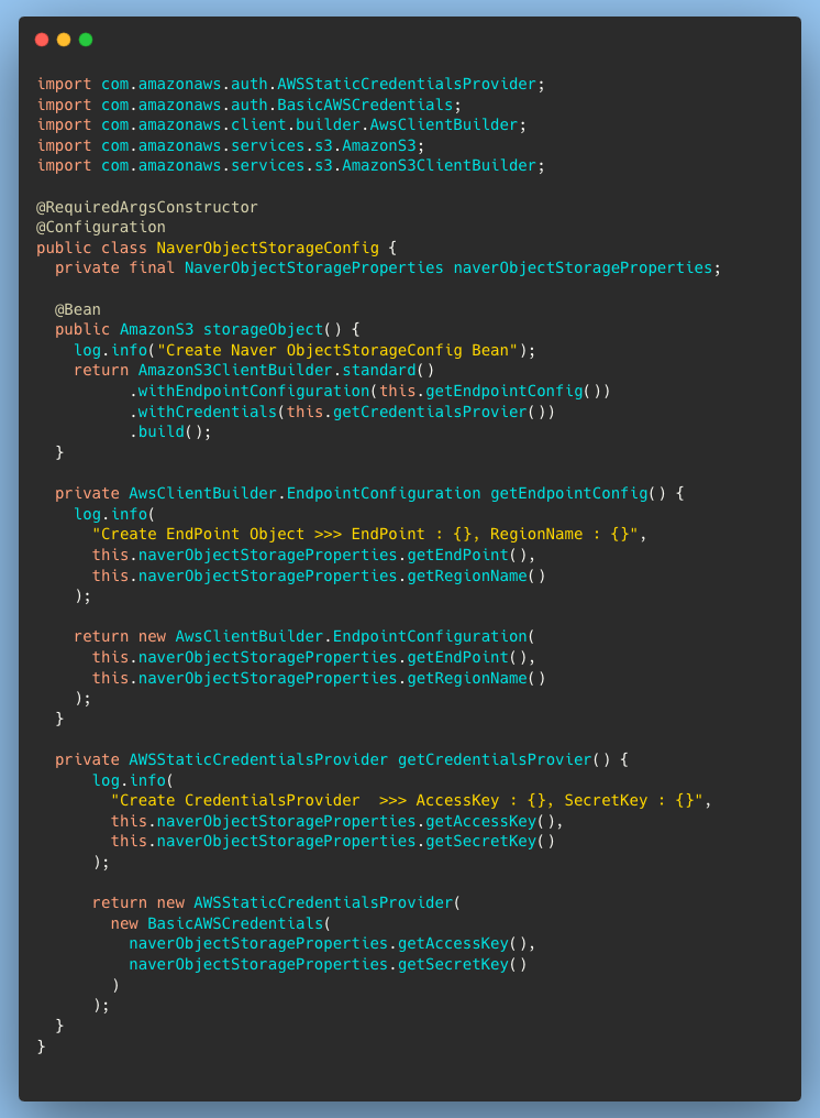 해당 코드에서는 FileUpload를 진행하는 Util에서 사용하는 S3의 Bean을 설정하는 코드만 존재한다.
