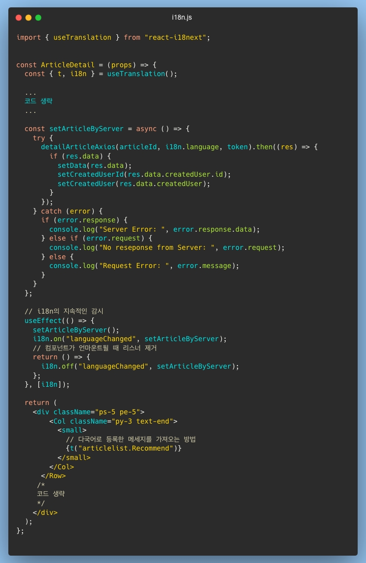 이후 필자의 경우에는 i18n을 effect를 통해 감지를 하였는데, 선택한 국가의 변경이 일어날 때 페이지의 모든 언어를 선택한 국가의 언어로 변경하고자 하여 감지를 진행하였다.