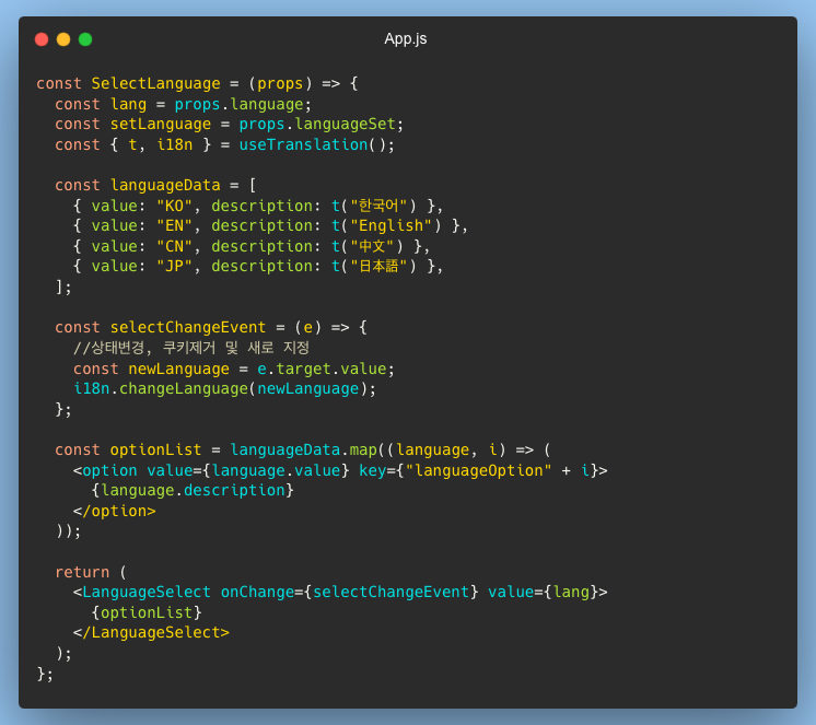 이후 셀렉트가 가능한 드롭박스의 코드는 아래와 같이 작성을 하였습니다.Option의 Value를 i18n.js의 resources에 선언했던 Key값으로 지정을 하였으며, onChange이벤트가 발생할 경우에는 i18n.changeLanguage의 설정 언어를 변경해 주었습니다.