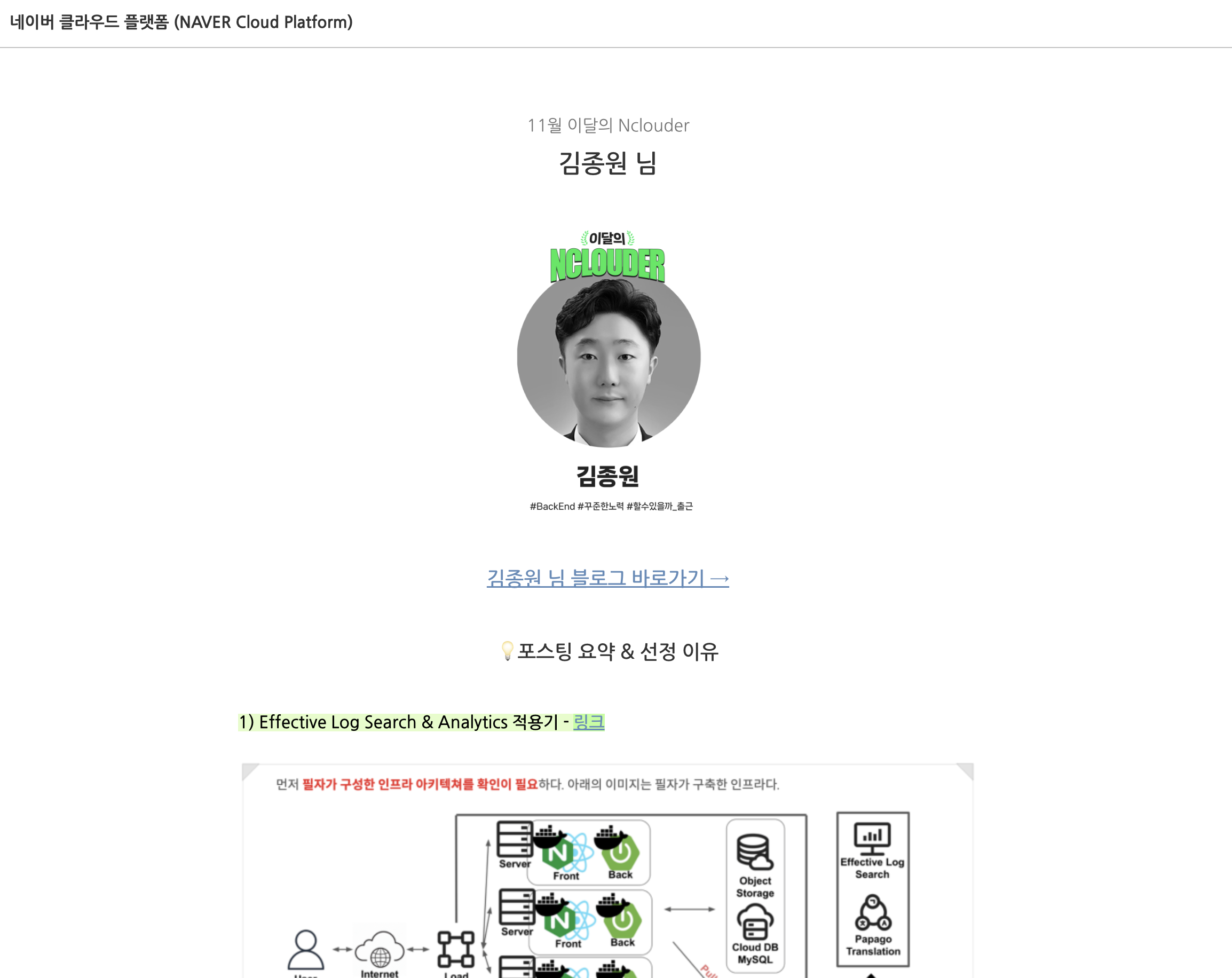 그렇게 네이버 클라우드 기술을 활용해 게시물작성한 11월 글들중 베스트로 뽑혀서 네이버 클라우드 블로그에 공식으로 소개가 되었다.