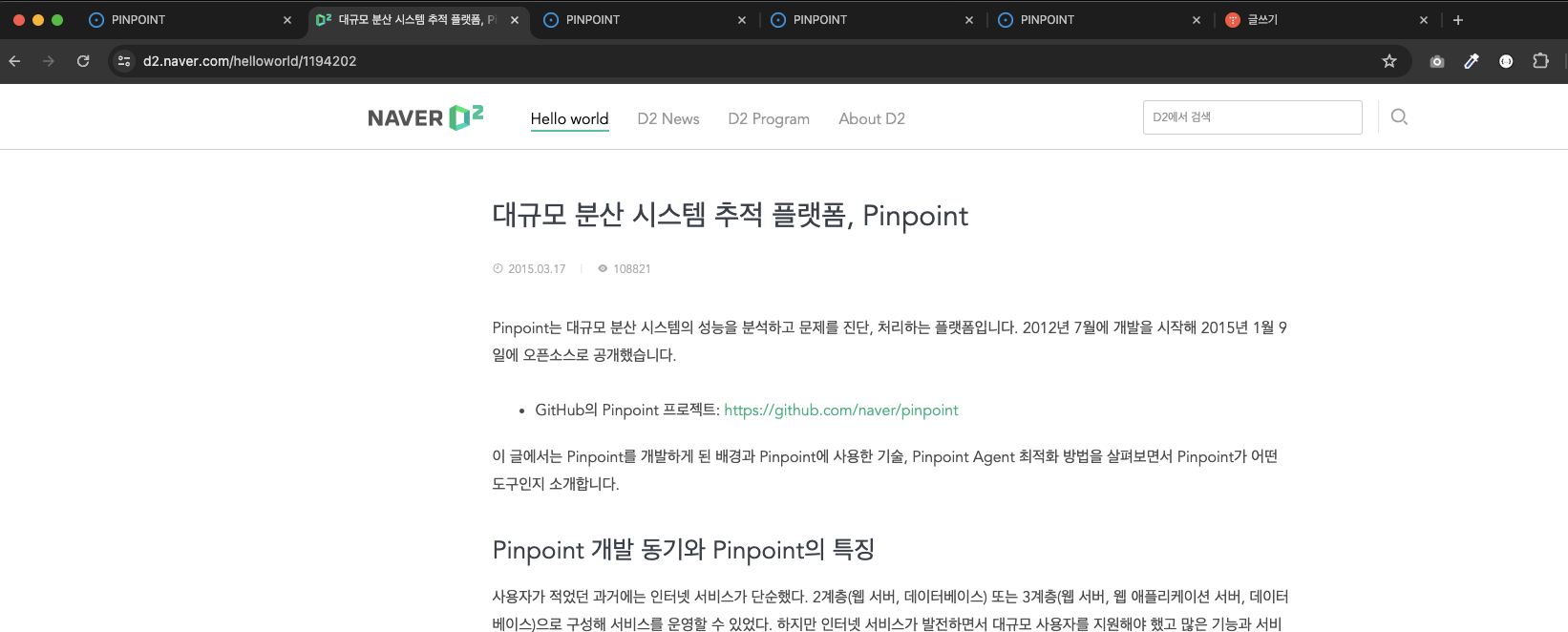 해당 페이지에서, Pinpoint개발자가 작성한 Pinpoint 기술문서 가 아래의 이미지처럼 helloworld.naver.com으로 링크를 페이지탭을 추가하고 있었다..