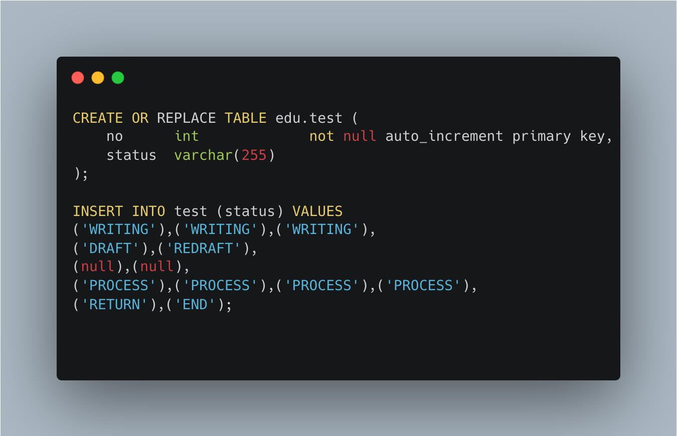 DRAFT, REDRAFT, RETURN, END가 각각 1건씩, null이 2건, WRITING이 3건, PROCESS가 4건을 삽입하였다.