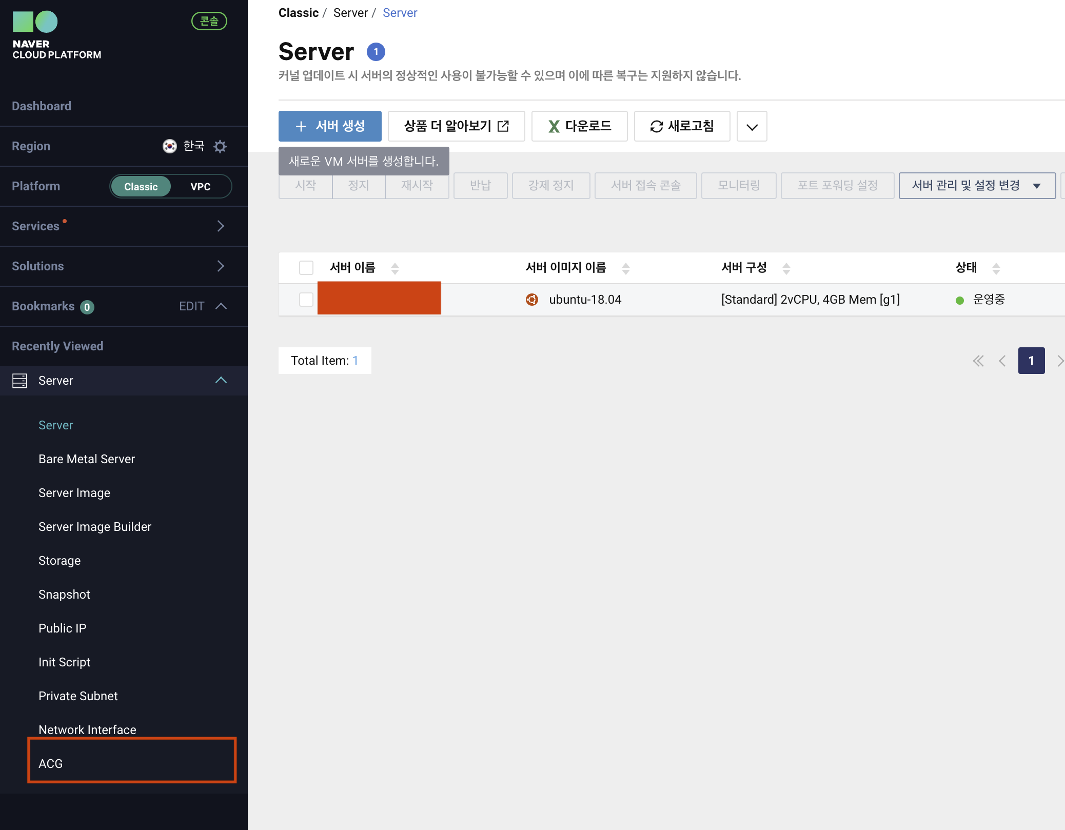 먼저 server 대시보드에서 현재 적용이 되어있는 ACG 규칙 명을 확인하자. 우측 하단에 설정된 ACG명의 확인이 가능하며,