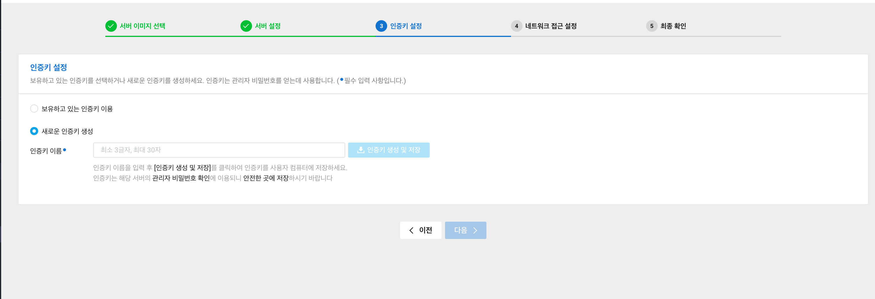 - 최초 인스턴스를 생성하는 계정의 경우에는 아래의 사진처럼 인증키 설정을 해야하며, 편한 이름으로 설정하면된다.