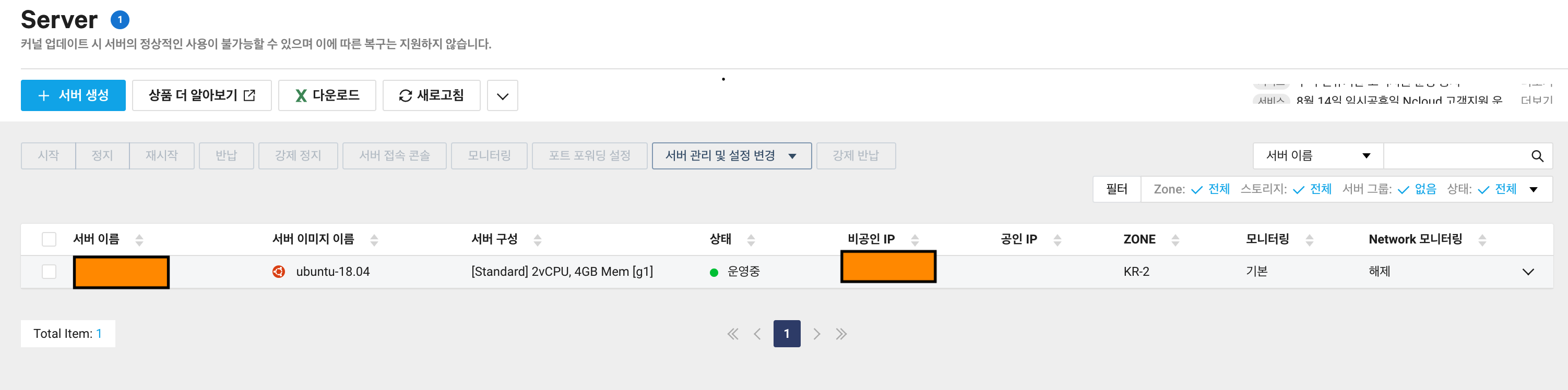 - 로그인을 하였으면 좌측의 메뉴에서 service-server페이지로 접속을 하게 될 경우 아래와 같은 대쉬보드가 출력이 되며, 서버 생성을 클릭할 경우 인스턴스의 생성이 가능하게 됩니다.