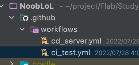 작업의 경우 필자는 CI, CD작업을 분할하였으며, 그러다 yml파일을 2개 제작하게 되었다.