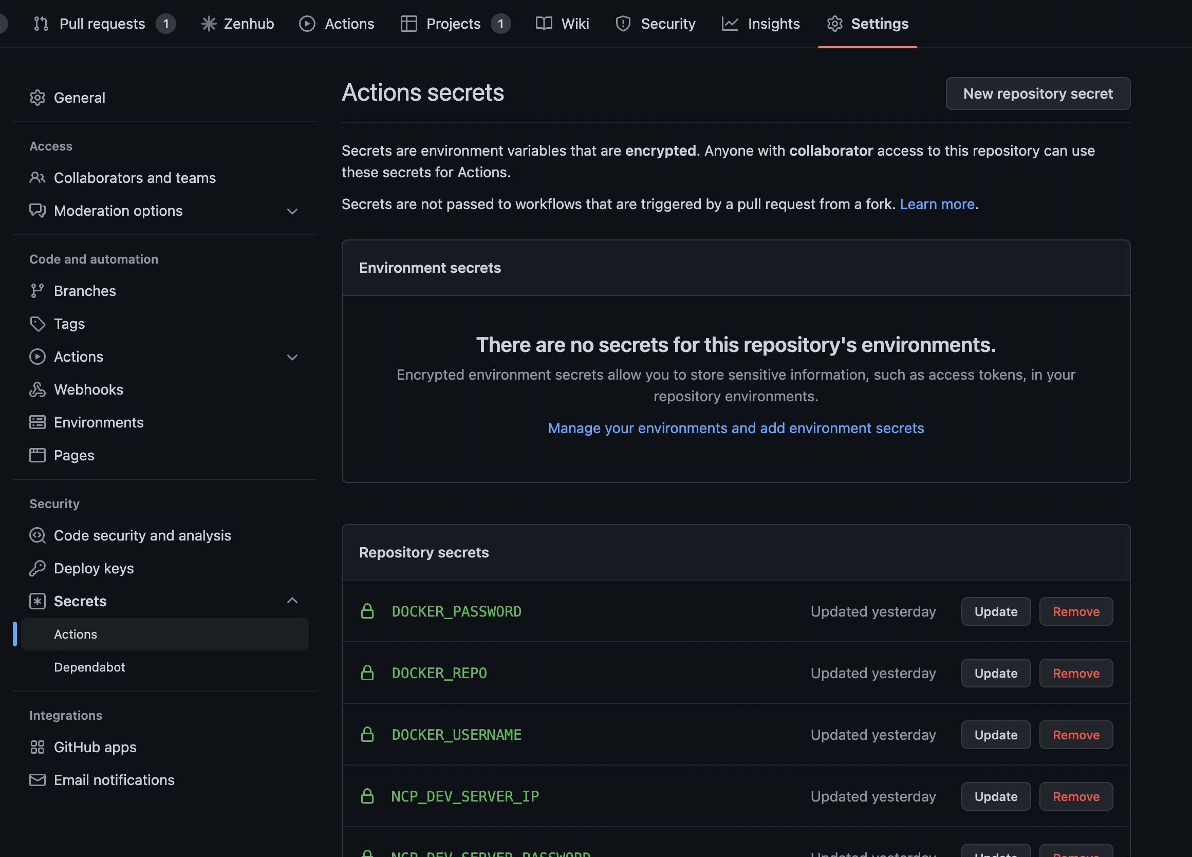 Repository → Settings → Secrets → Actions 항목에서 추가가 가능하며 New repository secret을 통하여 해당 희망하는 Key,Value의 추가가 가능하며 사용을 위와 같이 하면 된다.