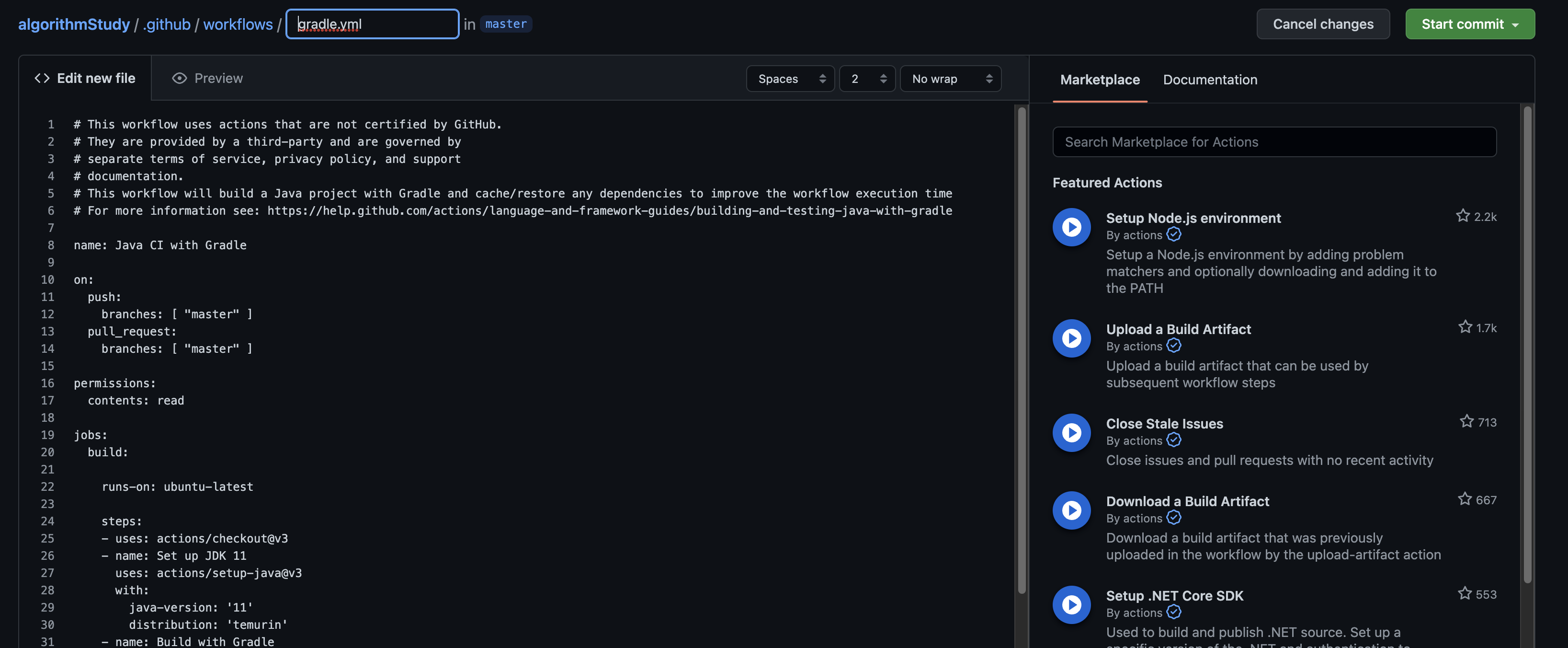 설정을 진행하면 아래와 같이 바로 yml을 생성후 커밋을 할 수 있도록 깃허브에서도 준비가 되어있다.