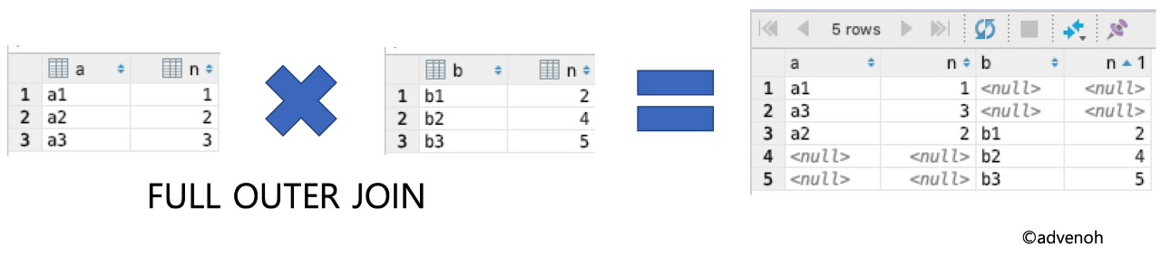 LEFT, RIGHT의 경우에는 A혹은 B의 데이터가 모두다 나왔다면 FULL OUTER는 모든 데이터가 다출력이됨 A와 매칭되는 B가 전부 출력이되며 없으면 NULL로 또 그러면서 B에 데이터가 있으나 A에 없어도 전부 출력된다.
