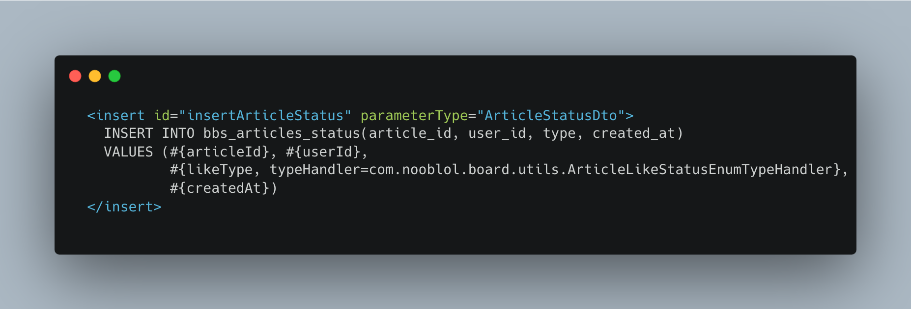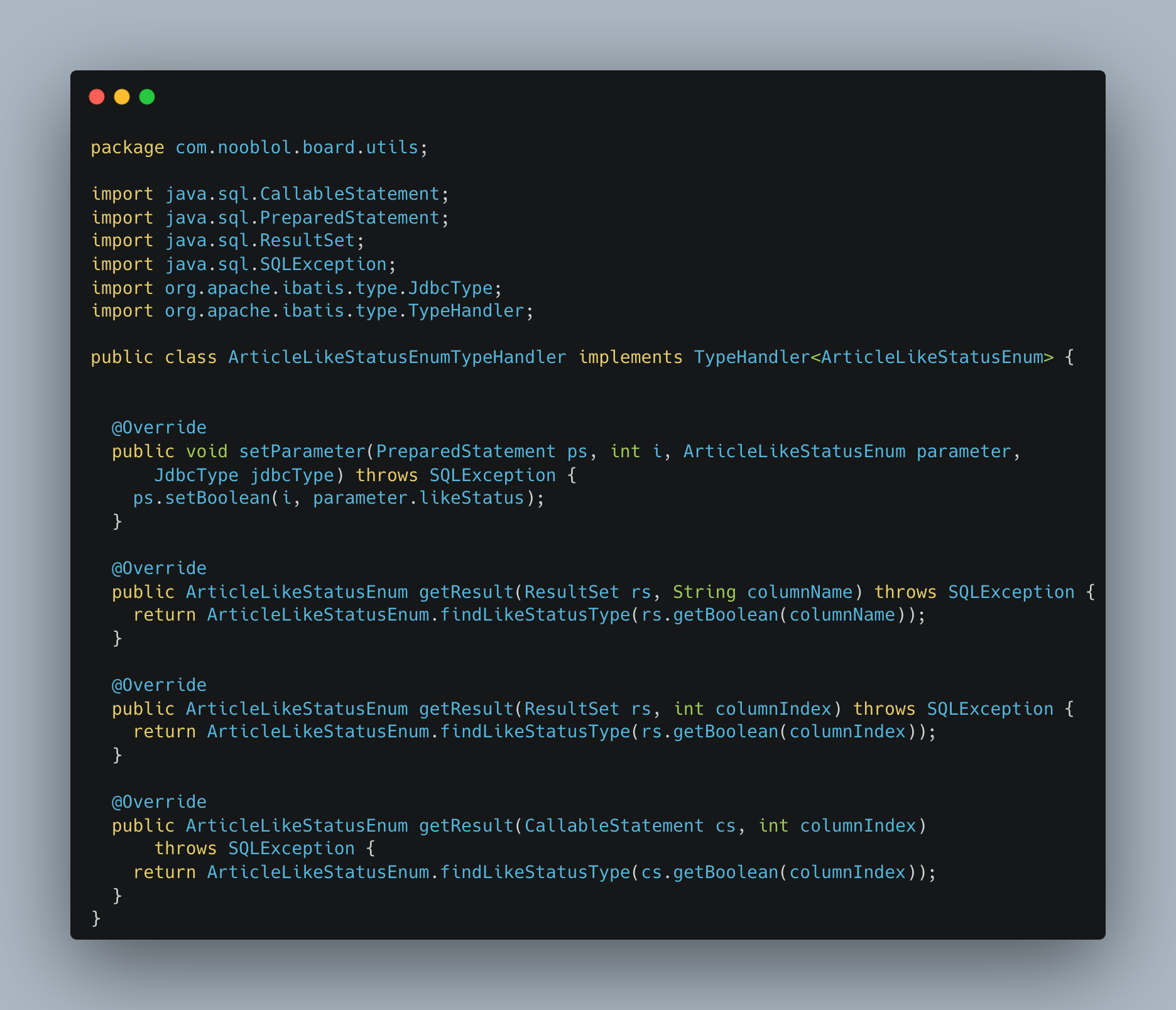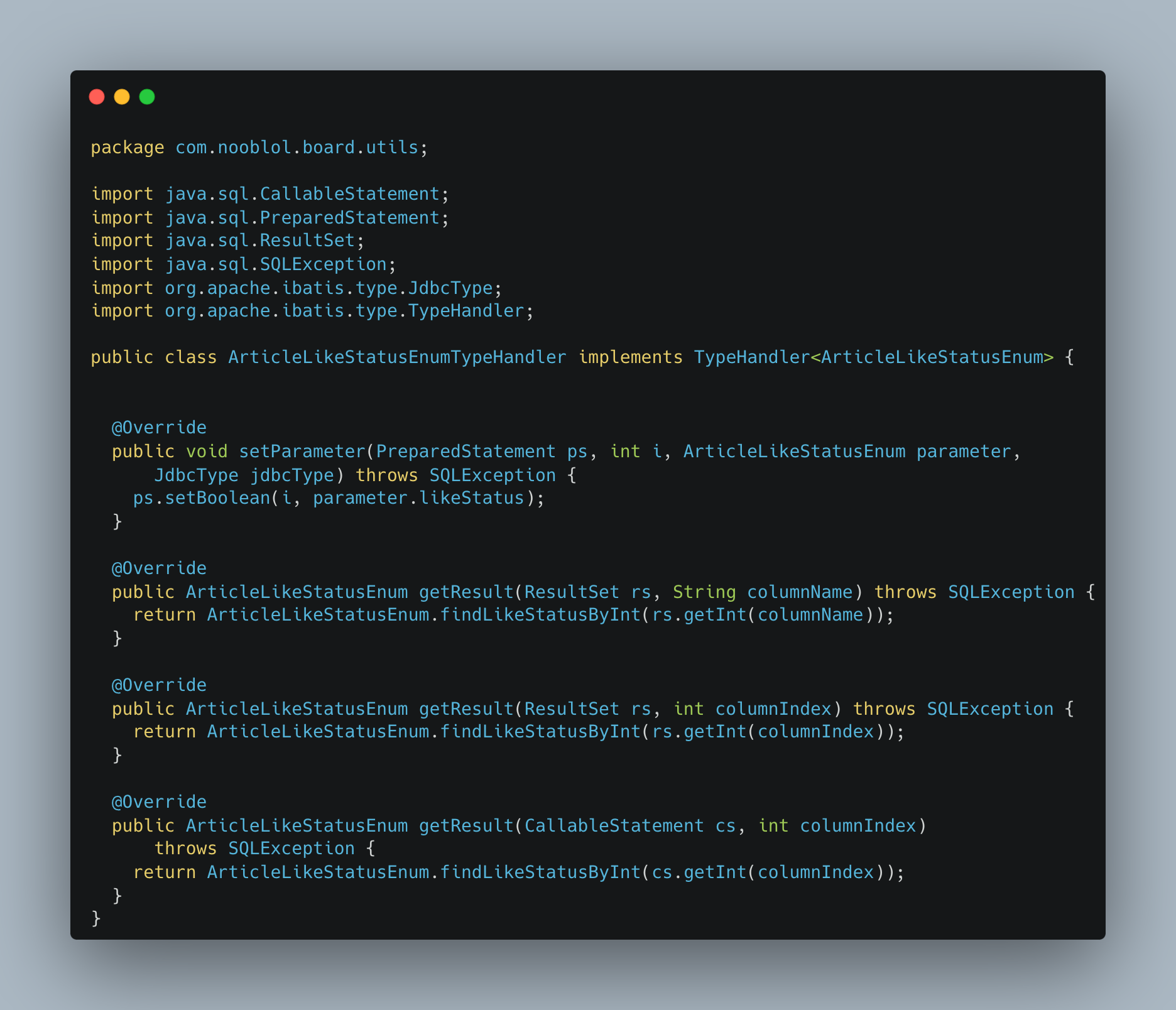 - 해당 Type에 대해서 사용을 할 수 있도록 ArticleLikeStatusEnum을 받아 사용하는 TypeHandler를 생성하였다