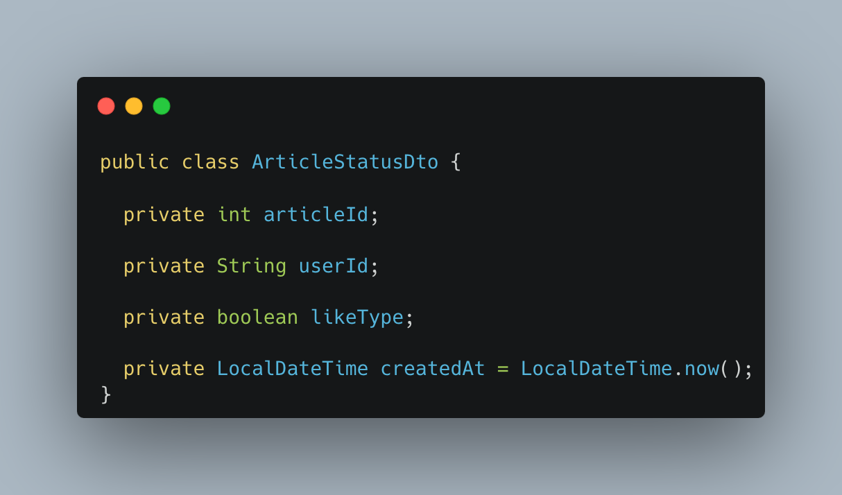 True, False를 통한 사용이 가능하다보니, 기존에 데이터를 주고 받을 때 사용한 DTO는 아래에 첨부하였지만, likeType이라는 항목에 대해서, boolean으로 사용을 하고 있었다.