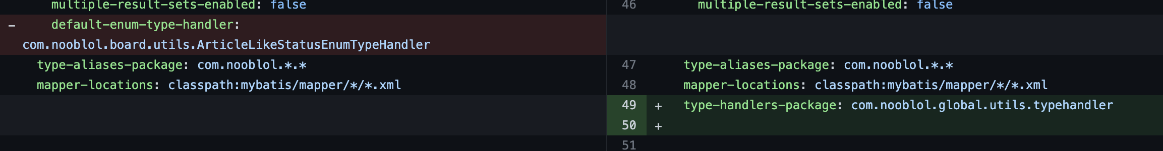 필자의 경우 global.utils.typehandler라는 패키지에 모두 집어넣었기에 해당 패키지를 지정해줘야했으며 application.yml에서 해당설정을 아래와 같이 추가 진행하였다.