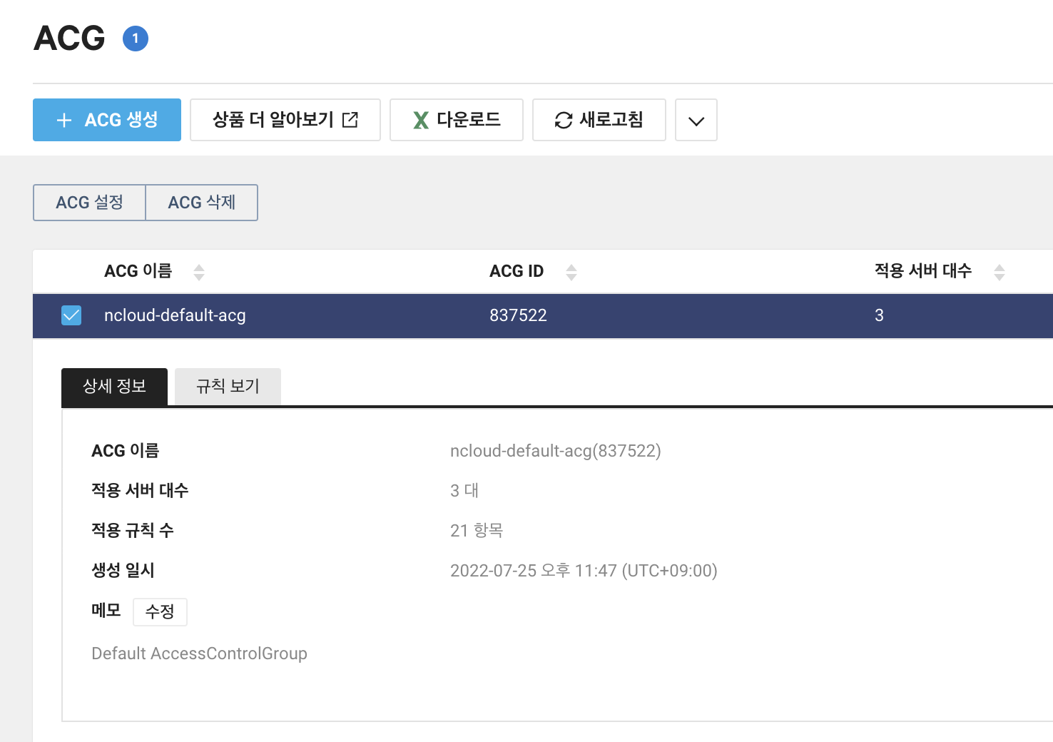 1. nCloud의 ACG로 이동하여 적용중인 서버의 ACG항목을 설정을 누른다.