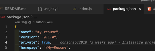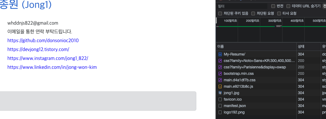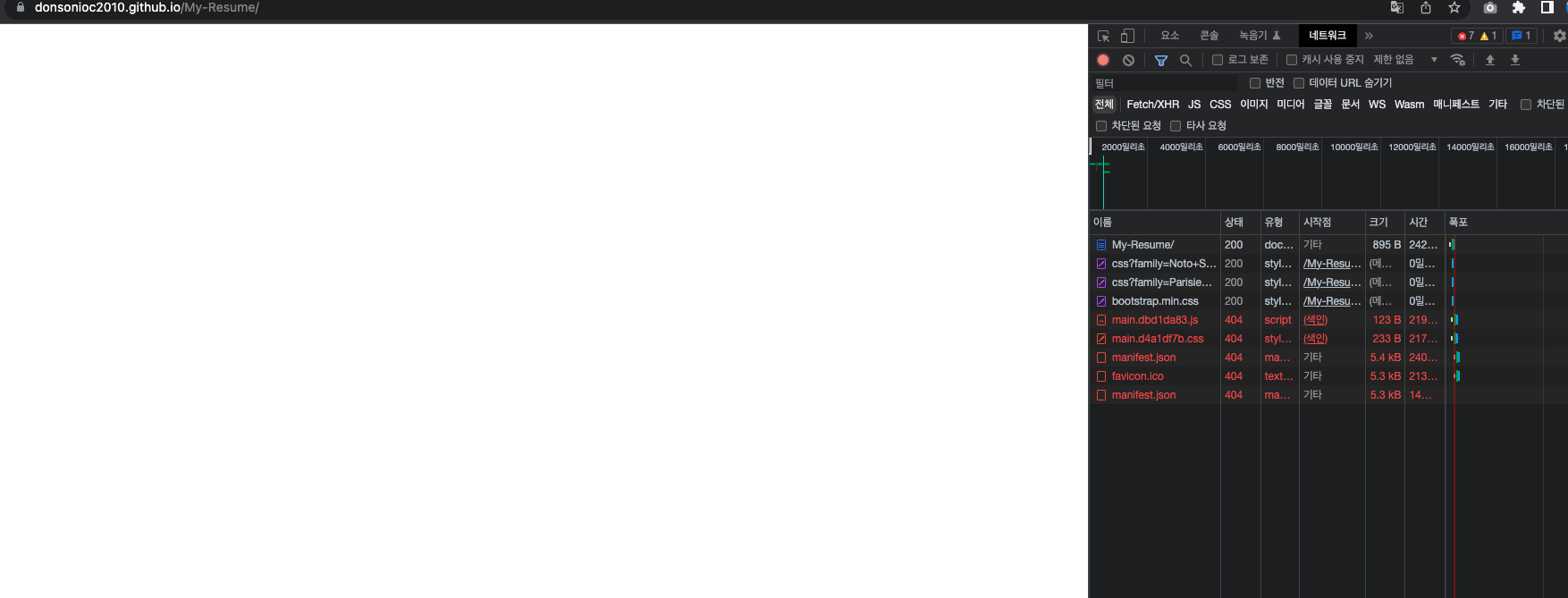 빌드를 진행한 이후 React에서 참조해야하는 파일들의 링크를 확인해봤고, My-Resume가 앞에 붙는것을 로컬로 우선확인 하였고, 이후 Push를 진행해봤다.
