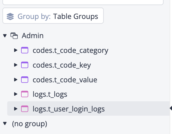 그러면 다음과 같이, 그룹으로 묶은 테이블, 묶지 않는 테이블로 나뉘게 되며, no Group을 클릭하게 될경우 해당 테이블리스트를 접거나, 펼치는 기능만 존재한다.