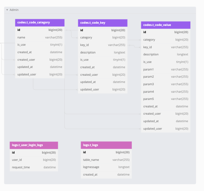 Admin이라는 주제로 관심사가 뭉칠 수 있는 테이블을 묶어봤다.
