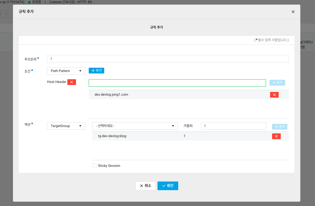 해당 설정에서 필자의 경우에는 도메인을 통한 분류를 진행할 예정이다. 따라서 조건의 항목에서 Host Header로 진행할 예정이긴 하나, Path로 분류할 경우에는 Path Pattern을, HTTP Header로 넘어오는 Value를 활용할 경우에는 HTTP Header항목을 활용해보기 바란다.