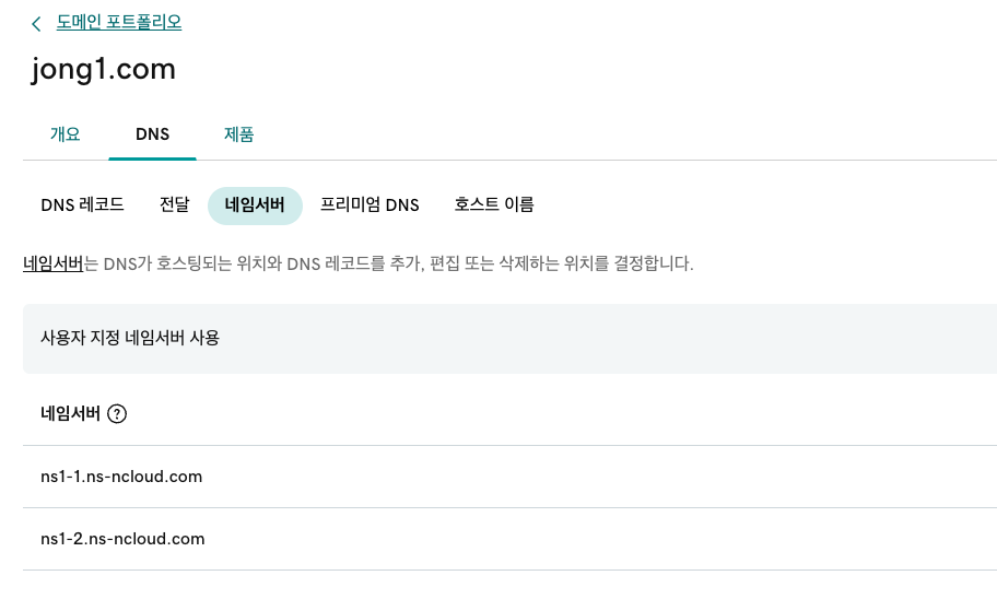 해당 정보를 필자가 구매한 도메인 사이트에서 네임서버 정보를 변경하였다.