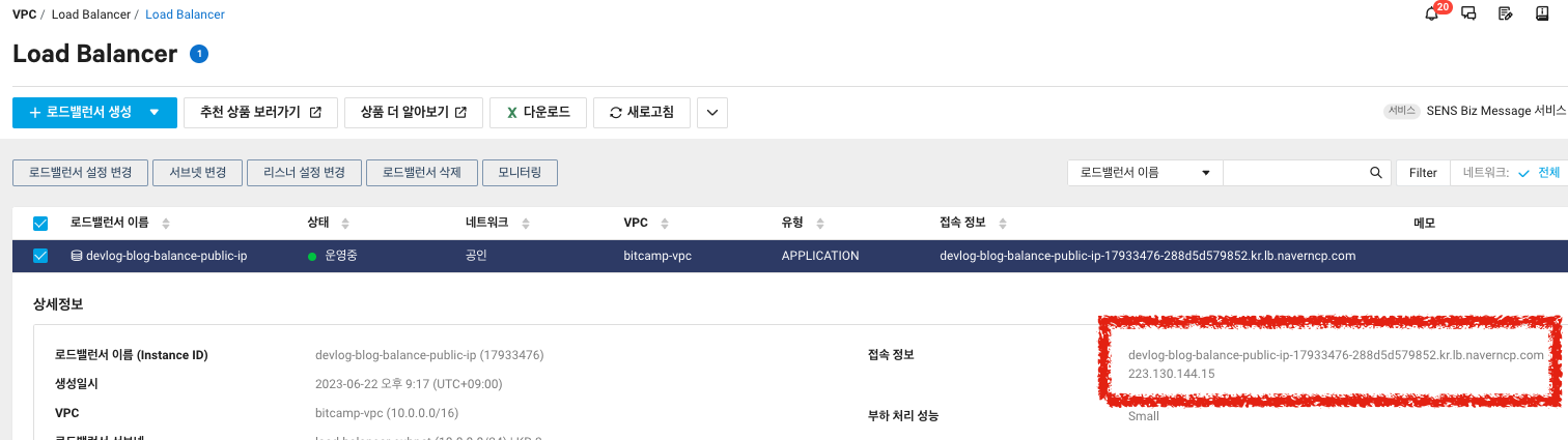 Load Balancer를 생성하면 로드밸런서에 아래의 빨간 박스처럼 접속정보가 출력이 된다.