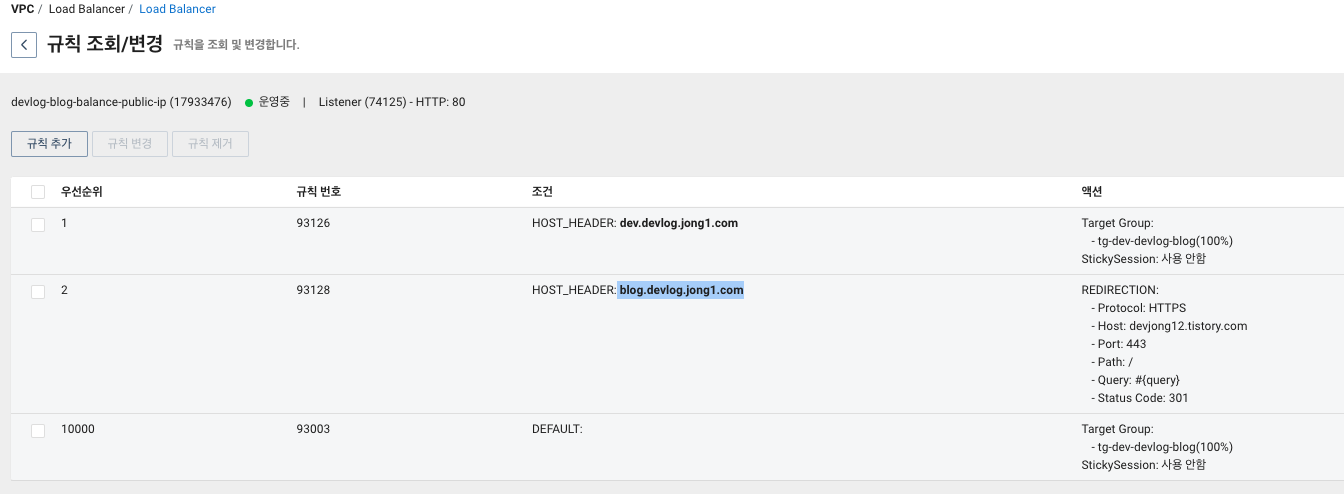설정을 마친 모습은 다음과 같으며, 두개모두 일단 같은 TargetGroup이지만, 추후 Default조건 Group을 변경하게 되면 dev.devlog.jong1.com으로 들어오는 요청과 그외의 모든 요청이 구분되어 사용되어 진다.