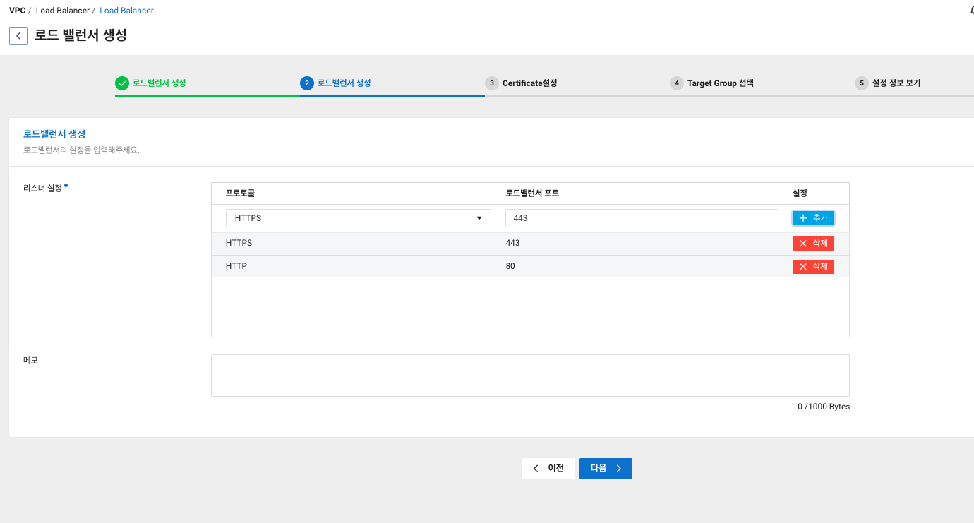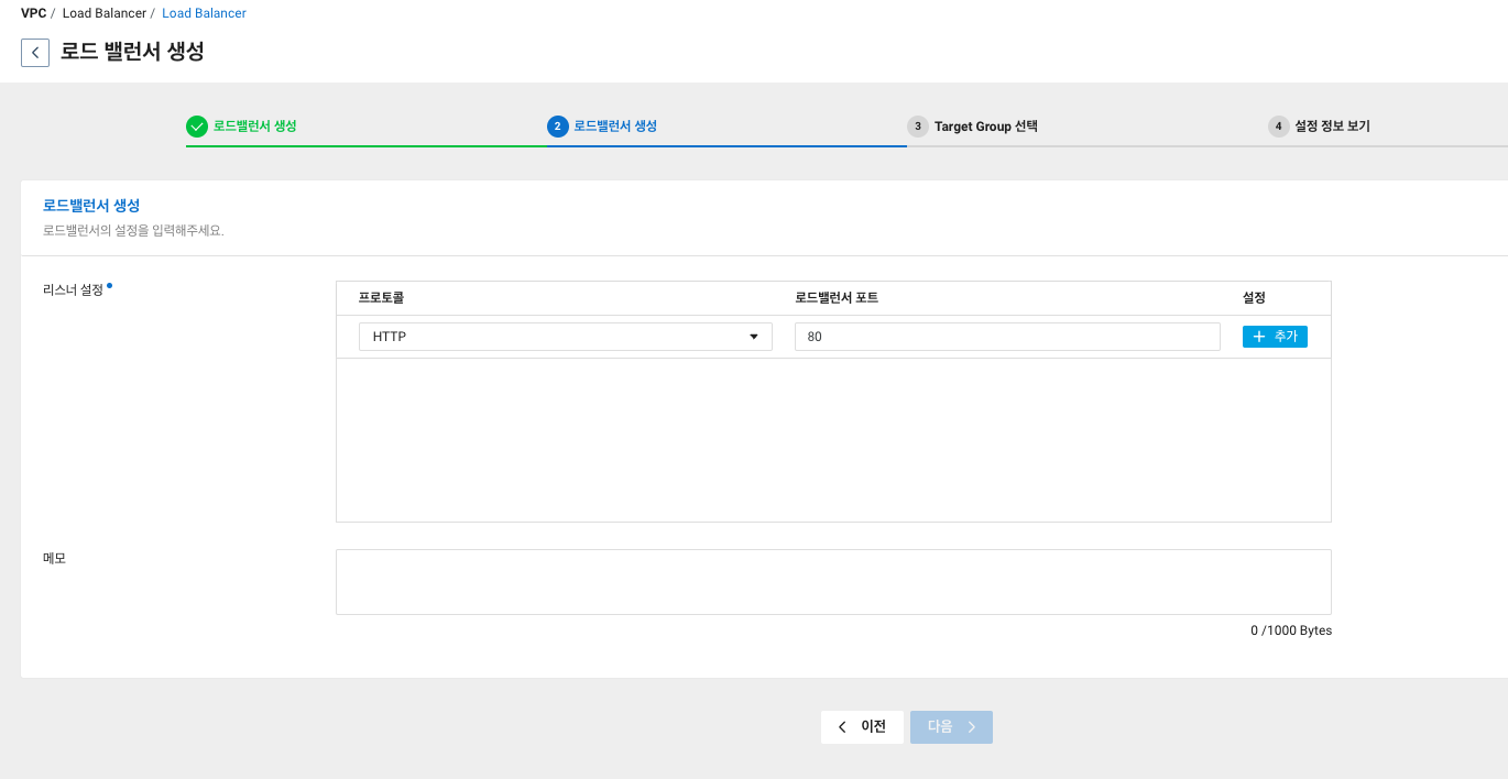 리스너란 로드 밸런서가 대기하고 있을 포트를 의미한다. 필자의 경우 웹서버 로드밸런싱이기에 80, 443 만 추가 진행하면 되나, 443을 추가할경우 Certificate설정까지 해야해서 현재는 80만 진행하였다.