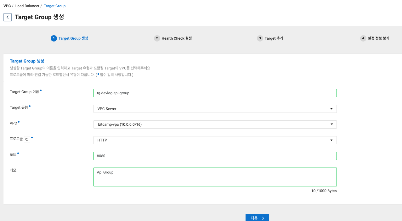 Target Group의 이름은 설정하는 개발자가 구분하기 쉬운 명칭을 임의로 지어주면 된다.