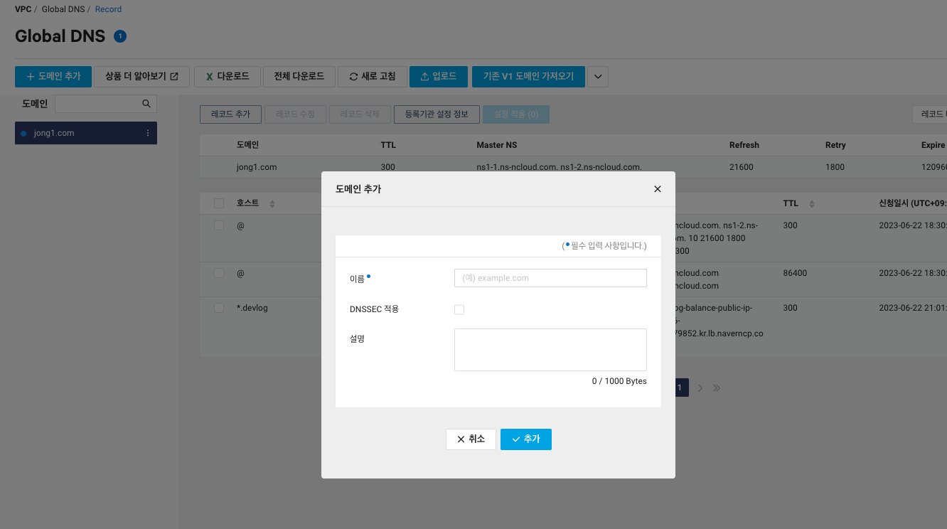 Global DNS에서 도메인 추가를 클릭 하게되면 아래의 화면이 표현된다.