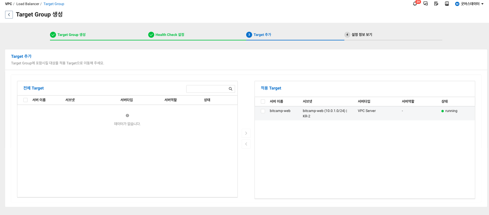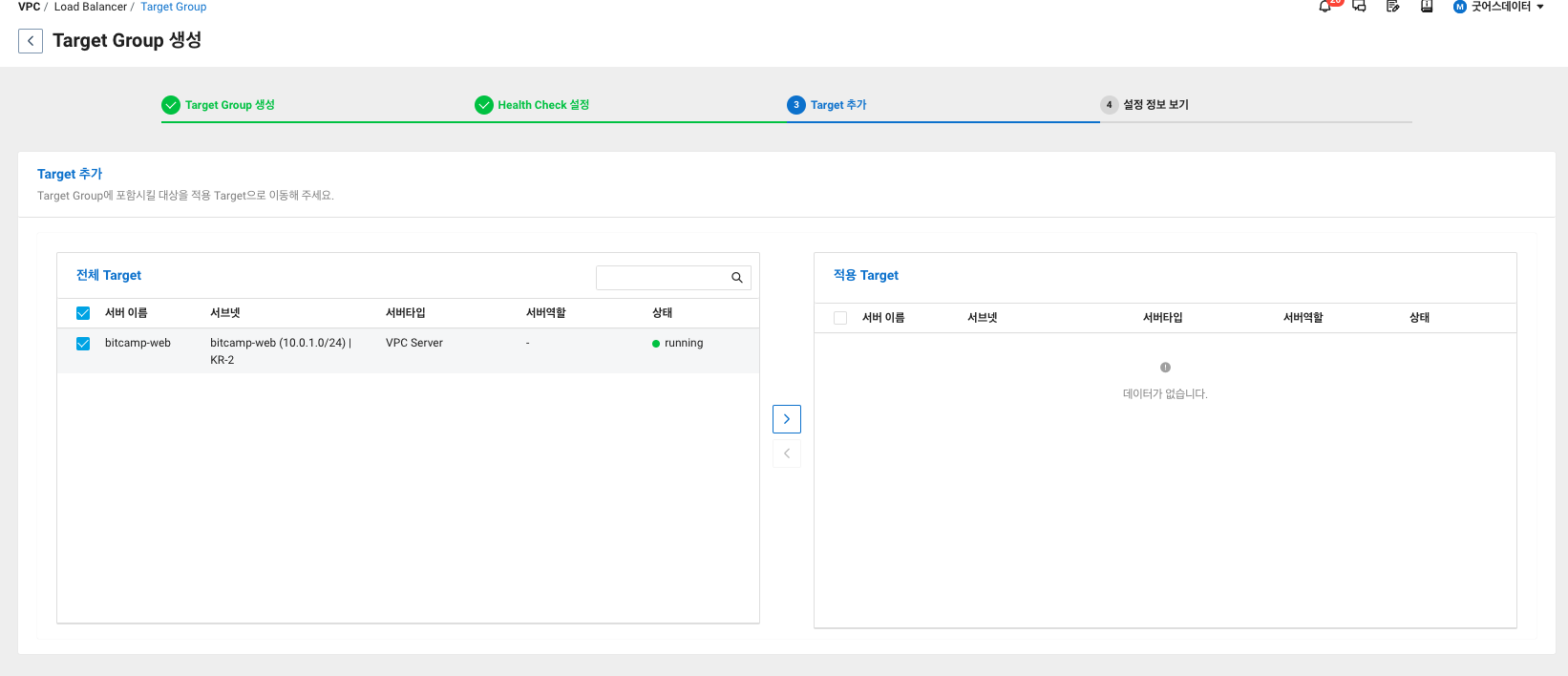 세번째 페이지의 경우에는 Load Balancer로 Request가 들어와서 해당 Target Group으로 분류가 될 경우 Request요청을 처리해줄 Server를 지정하는 페이지이다.