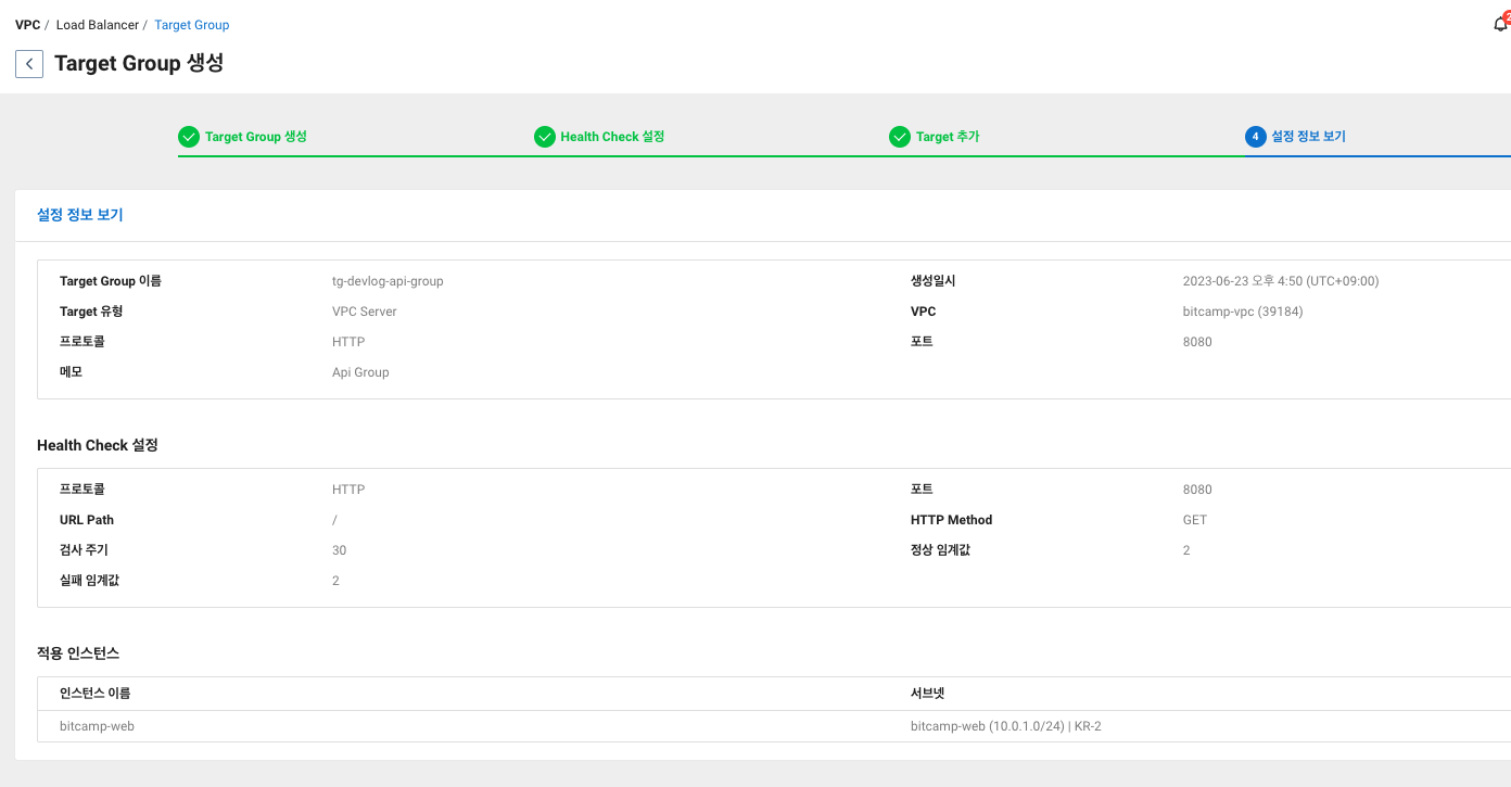 필자의 경우에는 Target Group을 생성까지는 하지 않아서 선택할 그룹은 없다.. 해당 페이지 이후 설정확인후 생성을 진행하면 된다.